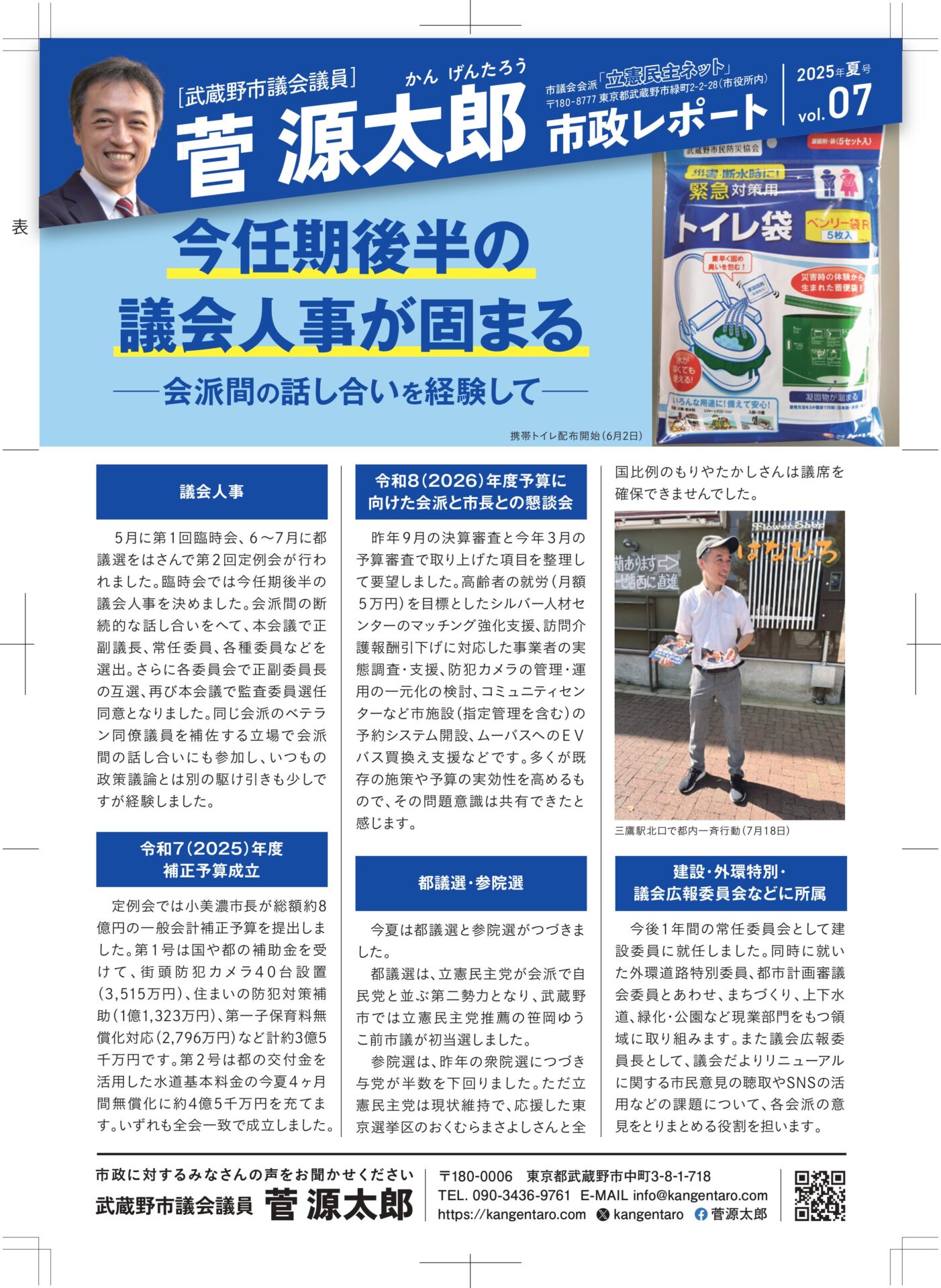 菅源太郎の市政レポートvol.7(2025年夏号)を発行しました。 今任期後半の議会人事が固まる、一般質問などを報告しています。ぜひお読みください。 PDFはこちら