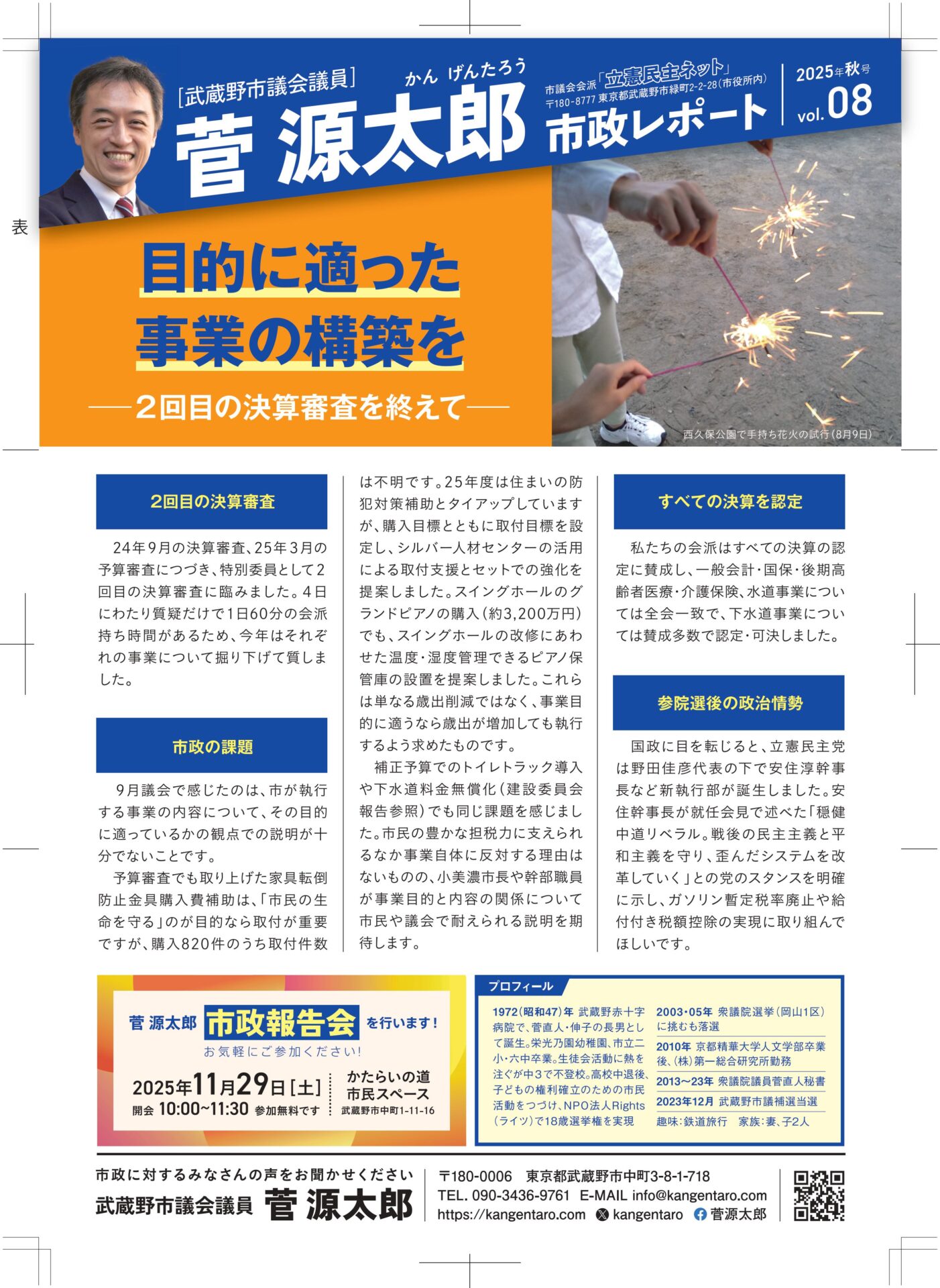 菅源太郎の市政レポートvol.8(2025年秋号)を発行しました。 2回目の決算審査を終えて、一般質問などを報告しています。ぜひお読みください。 PDFはこちら